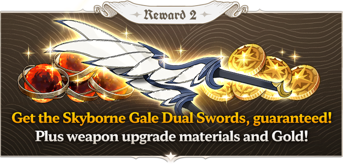 By registering through your email on the official website, you will get the Skyborne Gale Dual Swords when the game is released! You can also get weapon upgrade materials x 10 and Gold x 100,000.