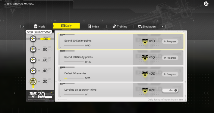 Operator Progression is where you can spend Stamina (Sanity) to collect materials needed for leveling up your characters. The training materials that you can obtain will vary depending on the stage, so check the materials that you need before taking the challenge.