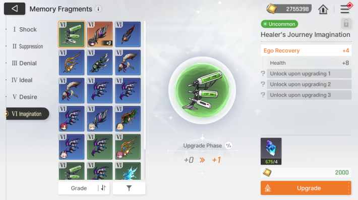 Memory Fragments can be upgraded by consuming exclusive upgrade materials and units. Each upgrade increases the value of the main option and unlocks a locked sub option.