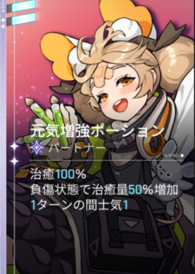 ![]() | 【EP】 2 Heal 100% +50% Healing amount while in Injured state 1 Morale for 1 turn |