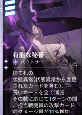 5凸 | When the assigned combatant generates a card, attack card damage is increased by 20% for 1 turn. Stacks up to 3 times. When the assigned combatant generates a Status Ailment card for the first time, +50% attack card damage for 1 turn. |