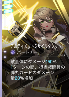 ![]() | 【EP】 3 150% Damage to all enemies For 1 turn, +20% Designated Combatants's Bullet Card Damage |