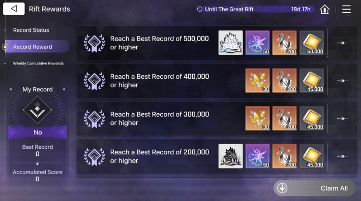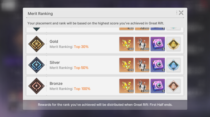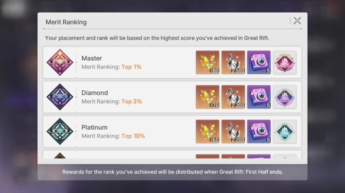 The high-difficulty content The Great Rift is now live. This is content where you aim for a high score, and there are three types of rewards: score achievement rewards, cumulative score rewards, and ranking rewards.