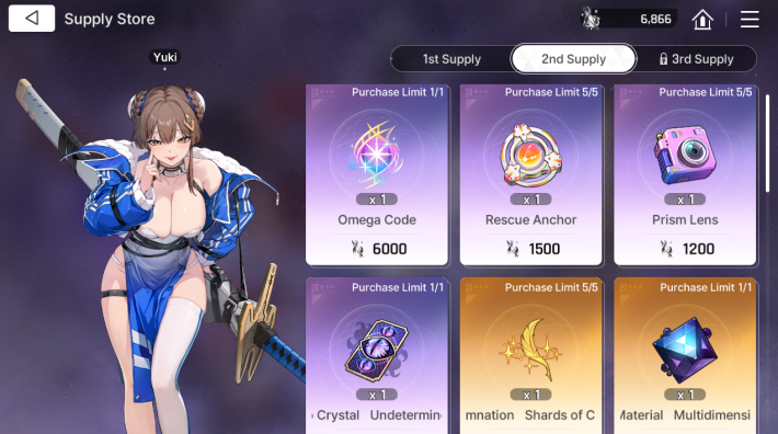 You can exchange Pure White Fragments for items in the Supply Shop. Secondary Supply has been added to the Resupply Shop, and you can also obtain Omega Code, which can be used for the Ego Awakening (Limit Break) of 5-star characters.