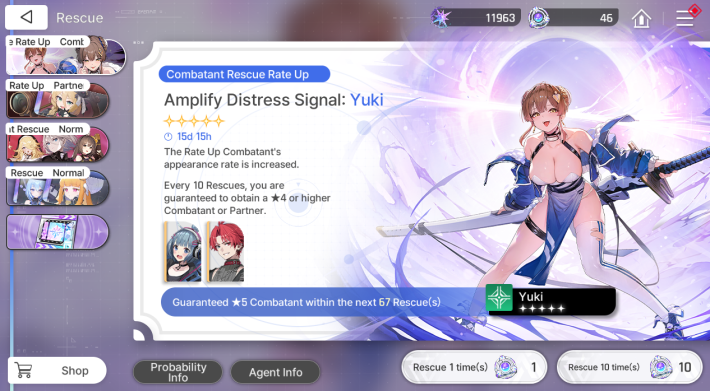 A new 5-star character, Yuki, has been added to the Combatant Pickup Rescue. Nia and Lucas are also featured.
