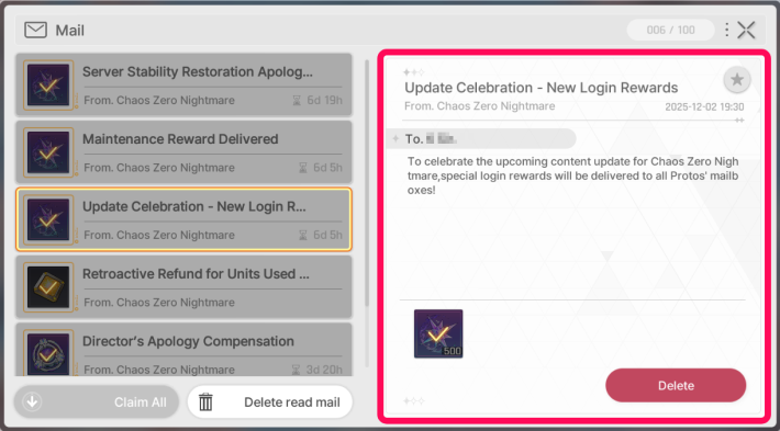 December 3 Update and Maintenance Patch Notes in Chaos Zero Nightmare. Includes Galactic Disaster Chapter 2 Forbidden Catalyst new contents, special login event and rewards in CZN.