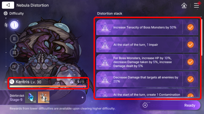 Nebula Distortion has 4 difficulty levels for each boss. As you increase the difficulty, the boss's level increases by 10. If you can't clear the highest difficulty, try lowering the difficulty and taking on the Challenges again.