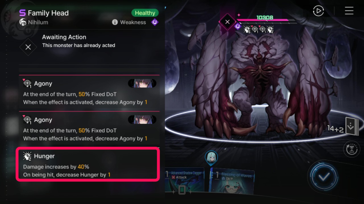 The Family Head gains Hunger at the start of each turn, increasing its damage dealt. The Hunger stack decreases by 1 for each hit taken, so use multi-hit attacks to keep it low.