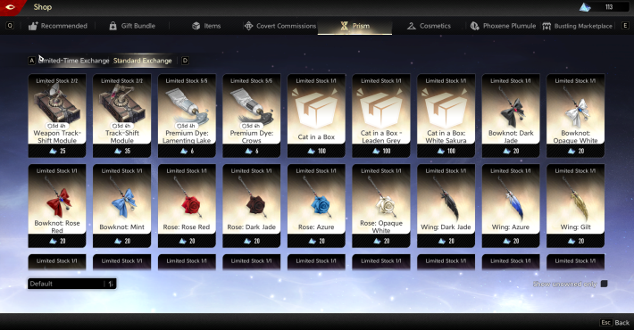 Iridescent and Lucent Prism can be used at the shop to exchange for in-game items such as Cosmetics, Emotes, Hourglass, Dye, and Module.