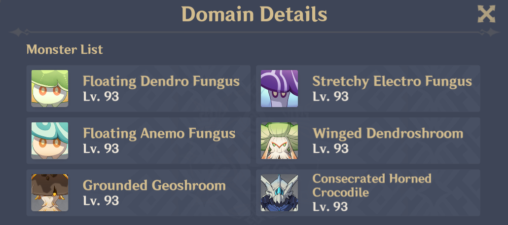 The expected monsters you are going to encounter in this domain are fungus, shroom, and Consecrated Horned Crocodile.
