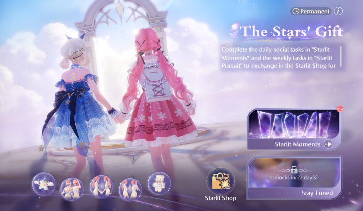 Wander through the Sea of Stars and experience the miracles of the vast starry sky. Participate in Starlit Moments and Starlit Pursuit to collect Starlight, then exchange it in the Starlit Shop for Decorations, Actions, and Outfits.