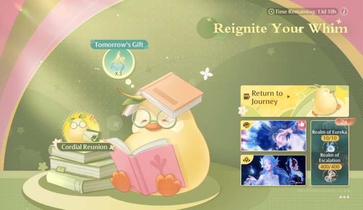 For 14 days after activating the event, returning players can enjoy a variety of rewards and bonuses. Log in to receive rewards from the Cordial Reunion and Starlit Reunion as well as complete Weaving New Visions tasks to earn even greater prizes. Take advantage of the Welcome Back Boost with Bonus Double Drops in the Realm of Eureka and Realm of Escalation.