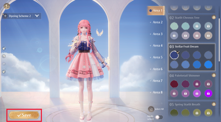 Once you’re satisfied with your dyed clothes, press "Save" at the bottom right to store your Stylish Outfit. You can save up to 7 Stylish Outfits and switch between them anytime.