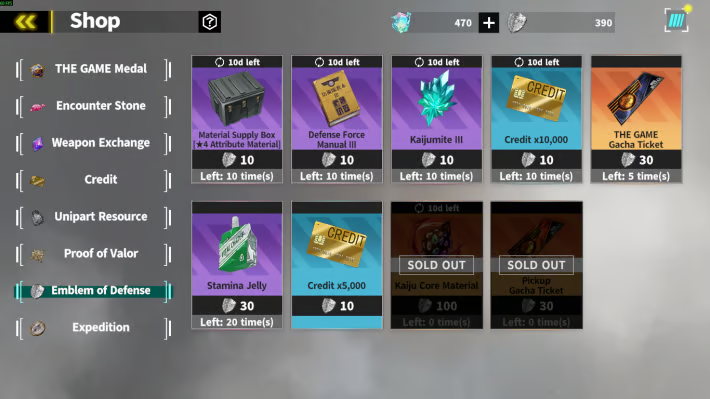 The exchange priority for the "Emblem of Defense" Shop is as listed above. Getting "Kaiju Core Material," "Pickup Gacha Ticket," and "THE GAME Gacha Ticket" is recommended.