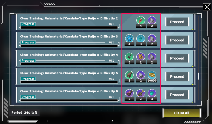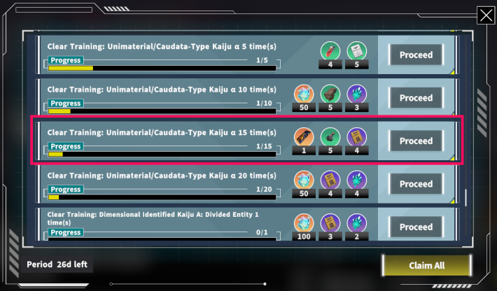 | Clear Training: Dimensional Identified Kaiju A: Divided Entity 1 time(s) | Dimensional Crystal x100 |