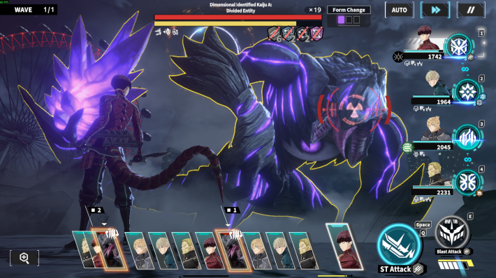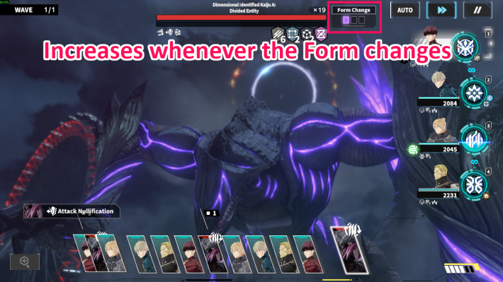 Kaiju A changes form every turn, and one of the gauges next to its HP bar will light up. Each time it transforms, its appearance and attack patterns change. Once all 3 gauges are filled, it unleashes a powerful attack that deals heavy damage, so make sure to prepare for that phase.