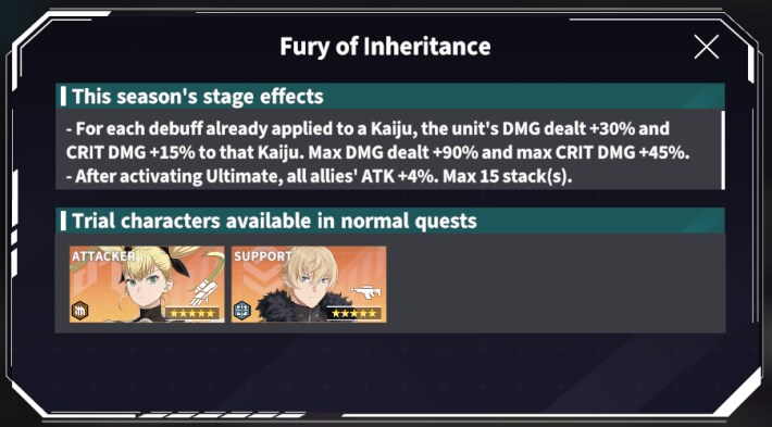 Stage Effects | - For each debuff already applied to a Kaiju, the unit's DMG dealt +30% and CRIT DMG +15% to that Kaiju. Max DMG dealt +90% and max CRIT DMG +45%. - After activating Ultimate, all allies' ATK +4%. Max 15 stack(s). - Effect Hit Rate +20%. |