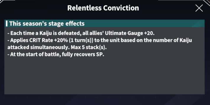 Stage Effects | - Each time a Kaiju is defeated, all allies' Ultimate Gauge +20. - Applies CRIT Rate +20% (1 turn(s)) to the unit based on the number of Kaiju attacked simultaneously. Max 5 stack(s). - At the start of the battle, fully recovers SP. |