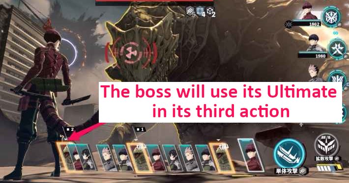 The boss uses a high-damage AoE Ultimate, so monitor your allies' HP. It will use its Ultimate on the third turn in the Action Order, as shown above.