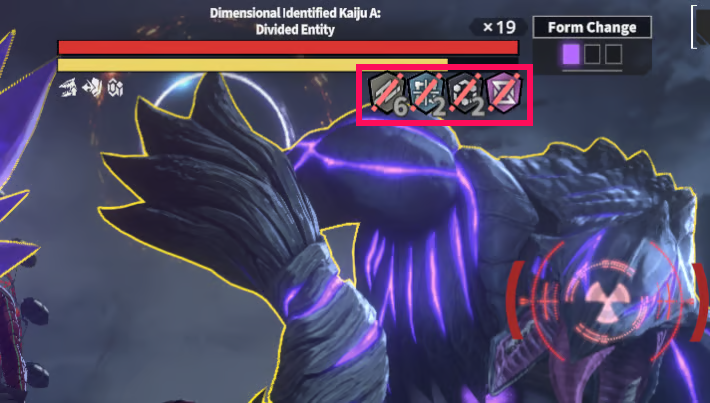 The boss in the second half of Stage 15, "Dimensional Identified Kaiju A: Divided Entity," has Slash and Physical Plates. It has x6 Slash Plates, so include characters who can break Slash Plates to expose its Core.