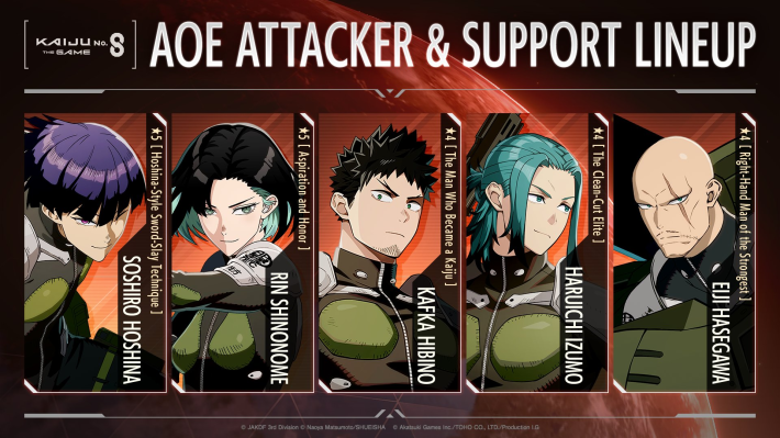 Soshiro Hoshina | - A Slash AoE Attacker - Can self-buff his damage - His single-target Ultimate is also useful for bosses. |