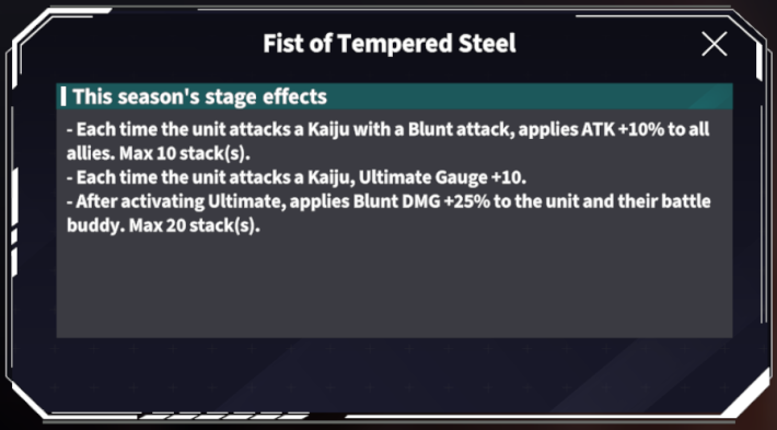 | Stage Effects | - Each time the unit attacks a Kaiju with a Blunt attack, applies ATK +10% to all allies. Max 10 stack(s). - Each time the unit attacks a Kaiju, Ultimate Gauge +10. - After activating Ultimate, applies Blunt DMG +25% to the unit and their battle buddy. Max 20 stack(s). |
