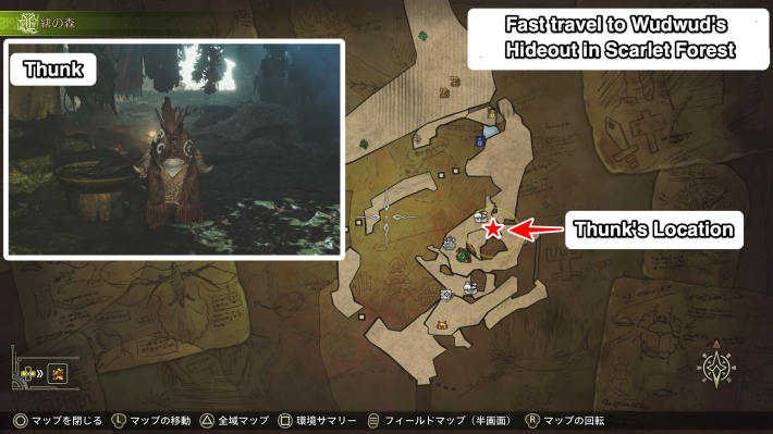 Thunk can be found in the same location regardless of the weather or time in the Scarlet Forest. If you can't find him, use the video above to locate him.