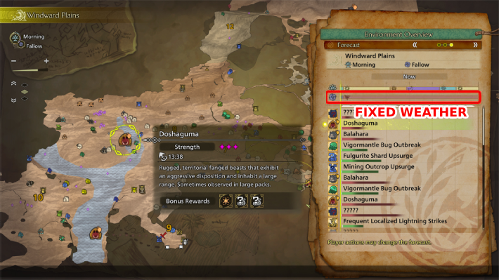 When you rest, you can specify and change the environment and time of day. This is especially useful when you're targeting monsters or endemic life that only appear under specific conditions.