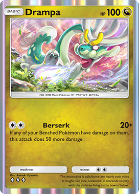Drampa's attack deals 20 damage for 2 Energy, but if you have a Benched Pokemon that has damage counters on it, the attack deals 70 damage instead. By pairing Drampa with a damaged Benched Pokemon, you can consistently activate its stronger attack effect.