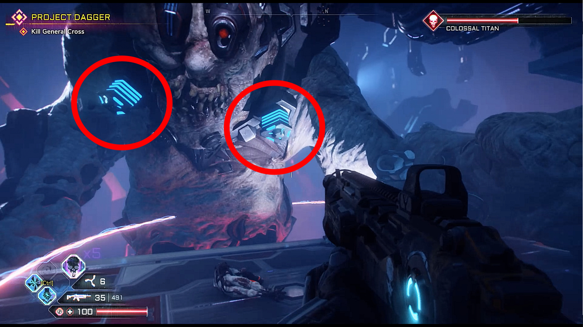 Much like the Cyber Crusher, the Colossal Titan can be beaten by focusing your fire on its weak points. These weak points glow blue and are featured all over its body. Having a strong weapon with a fast fire rate will melt the Titan's HP.