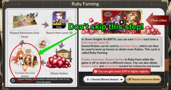 Once you feel that your Team is too weak to clear content consistently, or you simply cannot get past a certain stage, prioritize Ruby Farming to gather resources to power up your heroes. For F2P and casual players, this happens at around Region 8 and onwards.