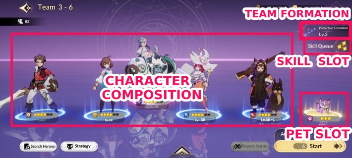 Party formation consists of five elements: Heroes, Pets, Formations, Skill Queue, and Equipment. Auto-formation is fine in the early game, but once you get used to it, try building a party based on your available units and the dungeon's characteristics.