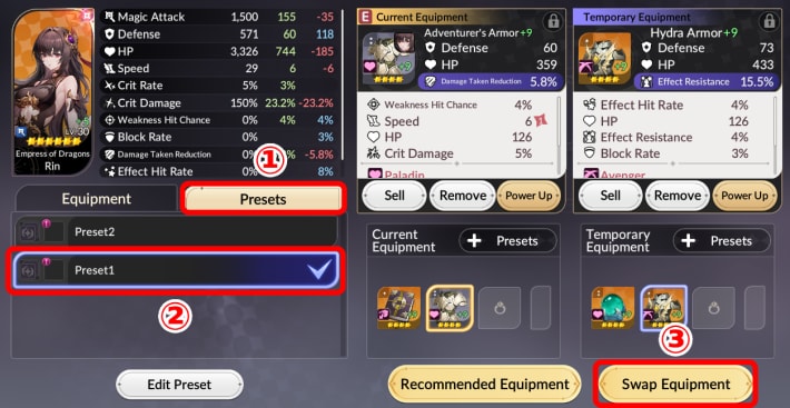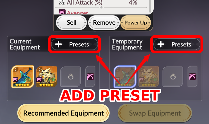 You can set up Equipment Presets from the Manage Equipment screen. Presets can be saved using either your currently equipped gear or gear you're previewing. Once saved, you can quickly swap loadouts through the Preset tab. For Heroes used across different game modes, creating multiple presets makes it easy to switch gear based on the content type.