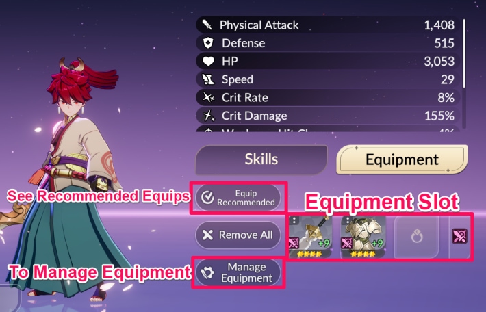 Equipment can be equipped from Home ➜ Hero's equipment slots or Manage Equipment. In the early game, it's fine to use Equip Recommeded, but once you get used to it, you should equip items to your liking.