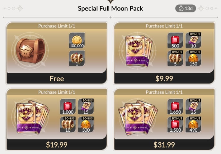 Full Moon Summon Voucher can also be obtained from Shop > Paid Shop > Special > Full Moon Special Package. For Rubies and Summon Voucher, the best value is in the order: $31.99 USD → $9.99 USD → $19.99 USD..