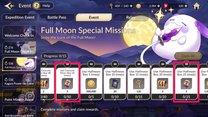 Go to Event on the top left of the Home screen > Event tab > Full Moon Special Missions. Complete event missions to get up to 20 Full Moon Summon Voucher. Collecting and using Crescent, Half Moon, and Full Moon Boxes will also help you complete these missions simultaneously.