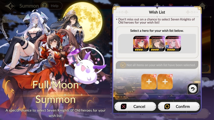 The Full Moon Summon is a limited gacha event that uses Full Moon Summon Voucher, obtainable during the event. You can wishlist two Seven Knights of Old heroes, making it a great chance to pull heroes unavailable in normal summons.