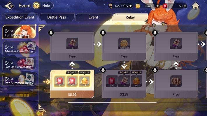 During the event, clearing Adventure stages has a chance to drop Crescent Moon, Half Moon, or Full Moon Boxes. Full Moon Boxes have a 15% chance to contain a Full Moon Summon Voucher, so take this opportunity to extensively do Ruby Farming.