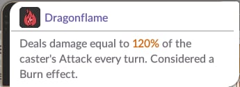 The effect of Dragonflame is basically the same as Burn, dealing damage equal to 120% of the skill user's Attack every turn. Other than the different damage multiplier, there is no difference, and the damage dealt is considered a Burn effect. You can use Jave to have the Dragonflame effect. At his 6th Transcendance, his Burn becomes more powerful as Dragonflame.