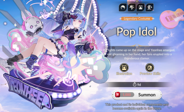 Pulling Yeonhee's Idol costume from the Costume Summon grants her outfit, profile picture, effects, 2D animated illustration, and exclusive skill animations, voices, and base scenarios. If you want Yeonhee's Costume and Illustration, it's worth pulling.
