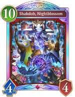 | - A combo deck that deals high damage with Shakdoh, Nightblossom - Deckbuilding is somewhat difficult because you need to draw cards of the same cost - Imperative to save your Super-Evolution until turn 10 | |