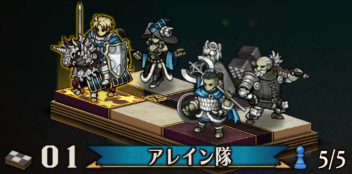 A formation adding Sharon to the early game Alain's unit. Sharon's HP recovery increases durability, and she can also remove debuffs. Promoting Alain to High Lord increases his mobility and makes him stronger against infantry.