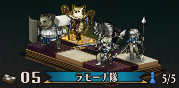 A Beastren-centric formation whose mobility, stats, and skill effects increase at night. The flying unit Ramona and high-evasion Dinah are weak to archers, so Bertrand protects them. Armored units are covered by Rosalinde's magic attacks.