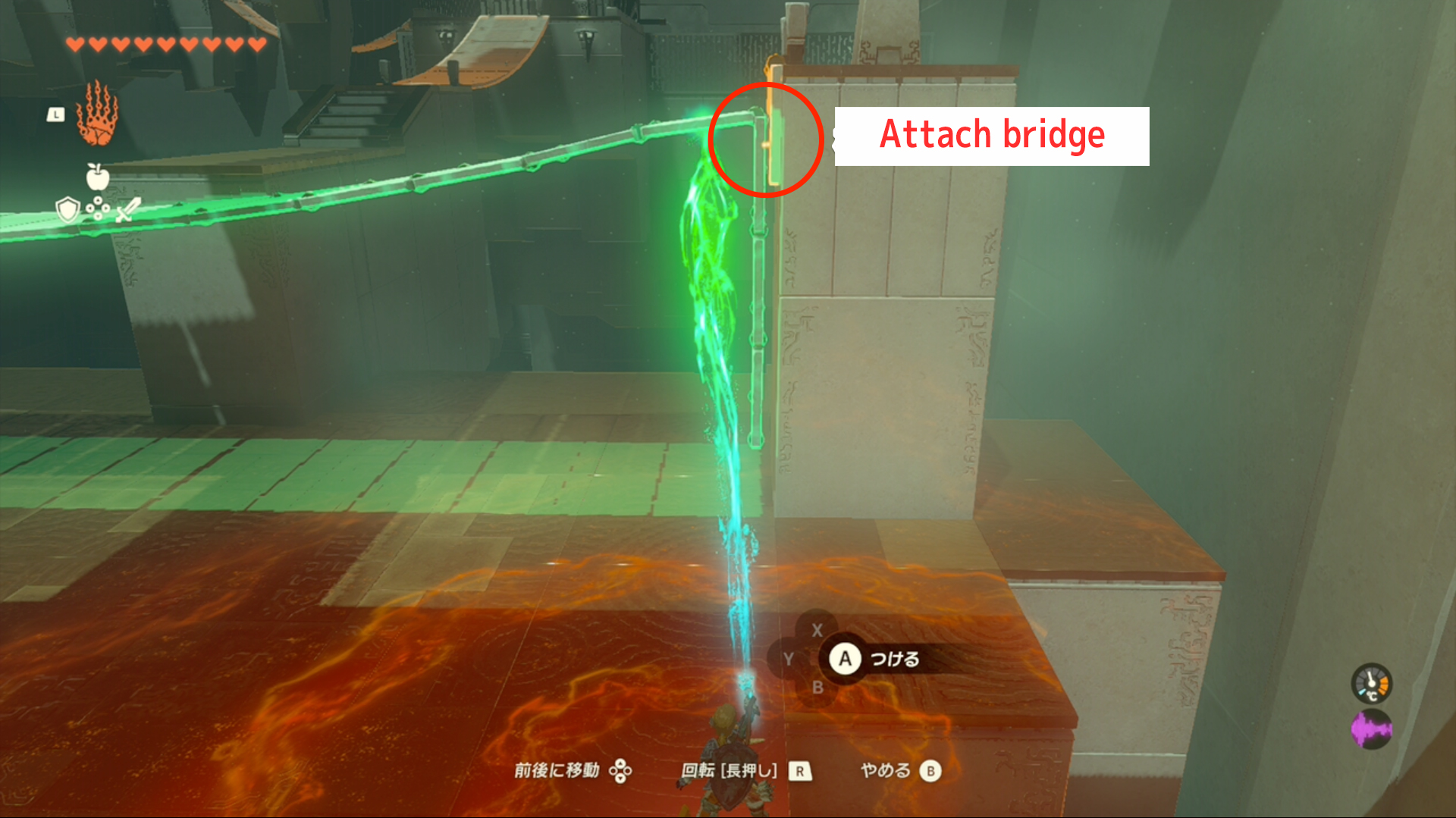 - Grab the edge of the bridge that has fallen with Ultrahand, and attach it to the other side of the bridge. Afterwards cross the bridge.